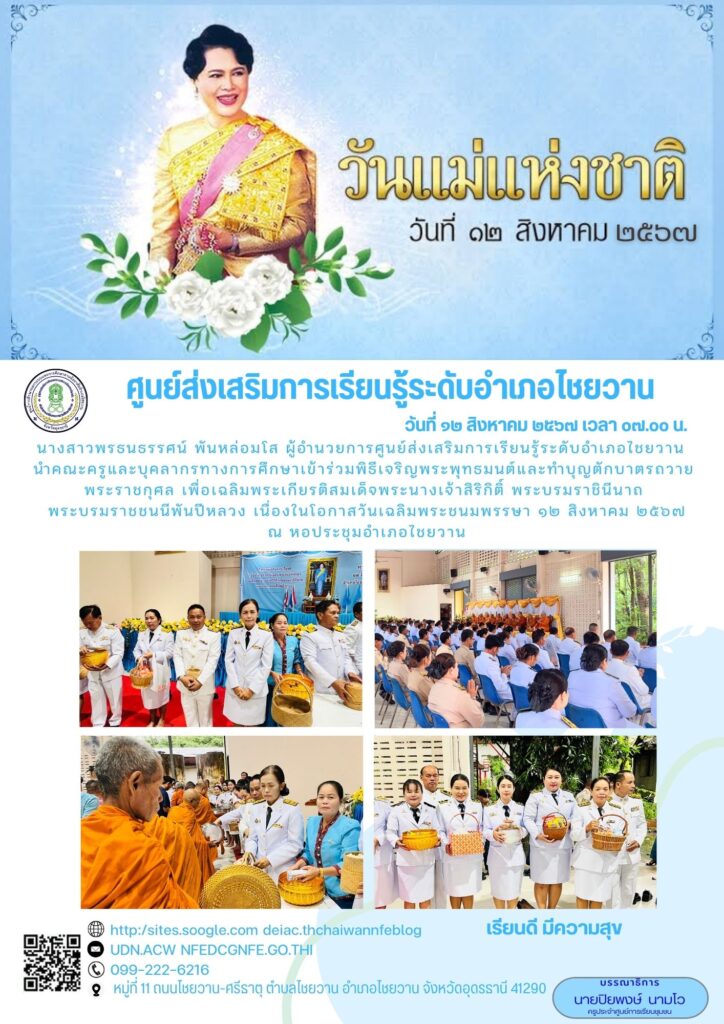 นางสาวพรธนธรรศน์  พันหล่อมโส ผู้อำนวยการ สกร.ระดับอำเภอไชยวาน นำคณะครูและบุคลากรทางการศึกษาเข้าร่วมพิธีเจริญพระพุทธมนต์และทำบุญตักบาตรถวายพระราชกุศล วางพานพุ่มและพิธีจุดเทียนถวายพระพรชัยมงคล เพื่อเฉลิมพระเกียรติสมเด็จพระนางเจ้าสิริกิติ์ พระบรมราชินีนาถพระบรมราชชนนีพันปีหลวง เนื่องในโอกาสวันเฉลิมพระชนมพรรษา 12 สิงหาคม 2567