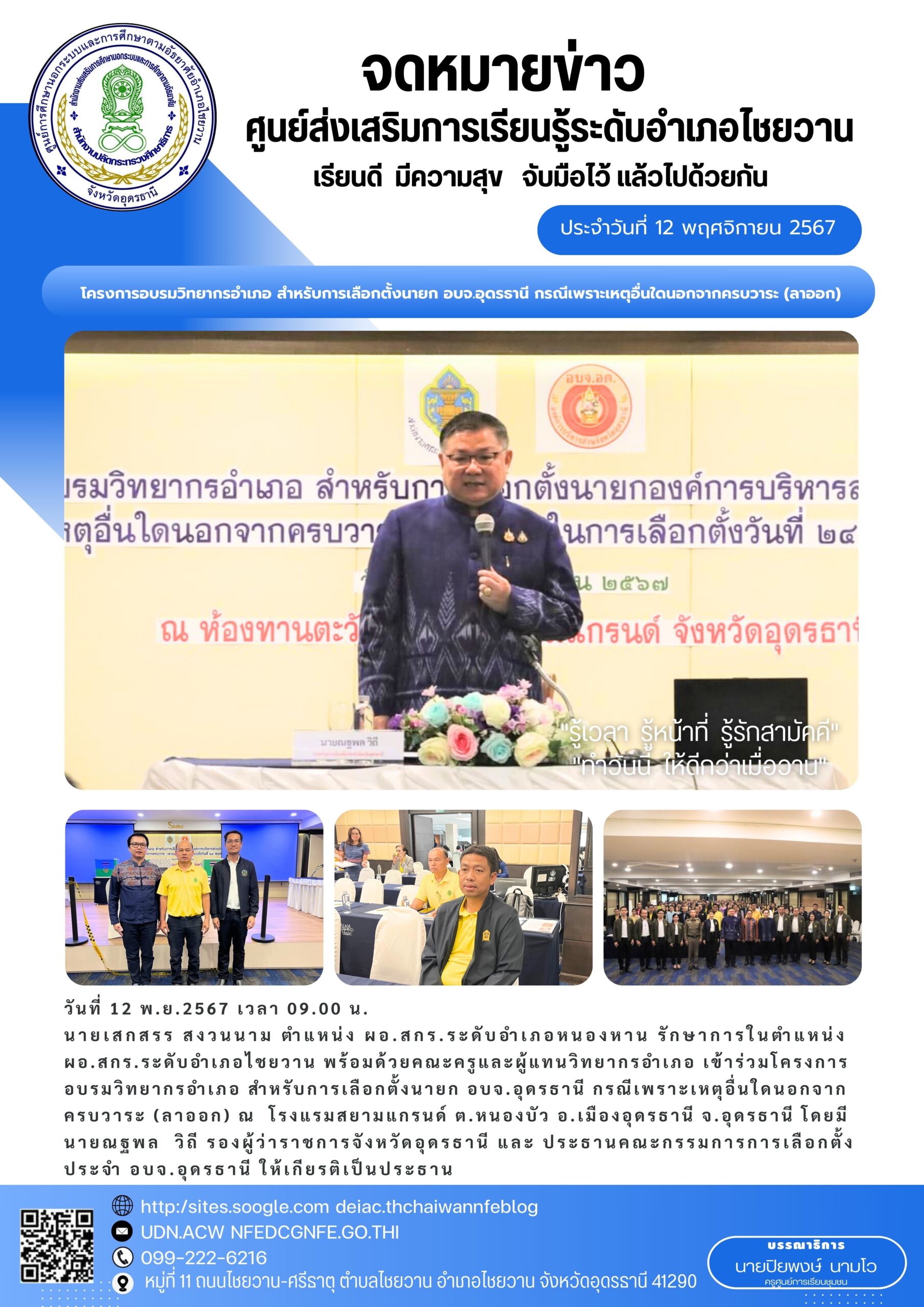 วันที่ 12 พ.ย.2567 เวลา 09.00 น.นายประเทือง เพชรโรจน์ ปลัด อบจ.อุดรธานี ปฎิบัติหน้าที่ นายก อบจ.อุดรธานี พร้อม หัวหน้าส่วนราชการ บุคลากรเจ้าหน้าที่ อบจ.อุดรดำเนินการจัดโครงการอบรมวิทยากรอำเภอ สำหรับการเลือกตั้งนายก อบจ.อุดรธานี กรณีเพราะเหตุอื่นใดนอกจากครบวาระ (ลาออก) และร่วมเป็นเกียรติในพิธีเปิดงานโครงการ ฯ ณ โรงแรมสยามแกรนด์ ต.หนองบัว อ.เมืองอุดรธานี จ.อุดรธานี